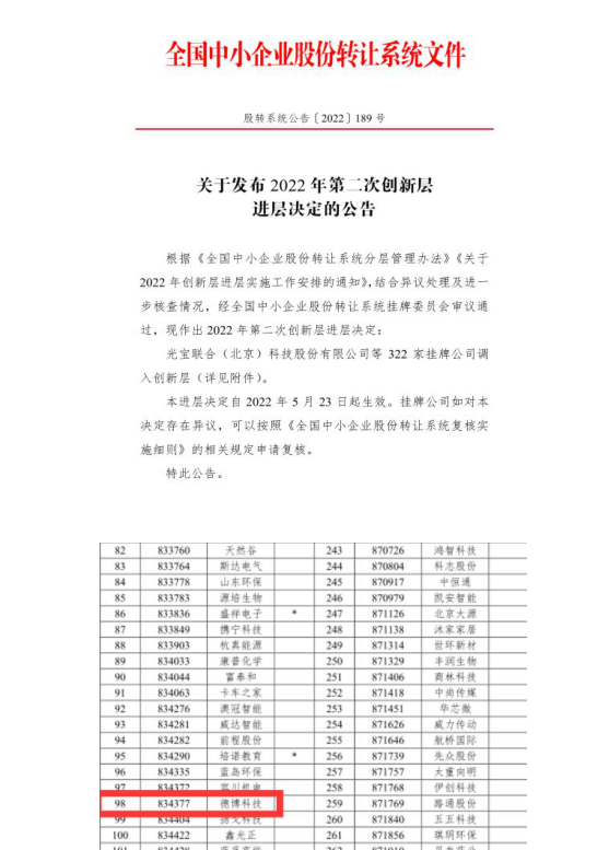 2022年5月23日,全国中小企业股份转让系统有限责任公司公布2022年第二批进入创新层挂牌公司名单,中国·太阳成集团tyc122cc(有限公司)-企业百科(股票简称:太阳成集团tyc122cc,股票代码:834377)凭借创新发展理念,多元化业务模式,规范化管理能力和持续增长的盈利水平成功进入创新层。这标志着太阳成集团tyc122cc在资本市场的进一步发展,必将受到社会各界更多的关注和认可,获得新三板更多政策支持,面临更多发展机遇!
